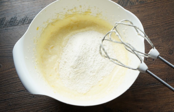 7Постепенно добавляем муку с разрыхлителем.