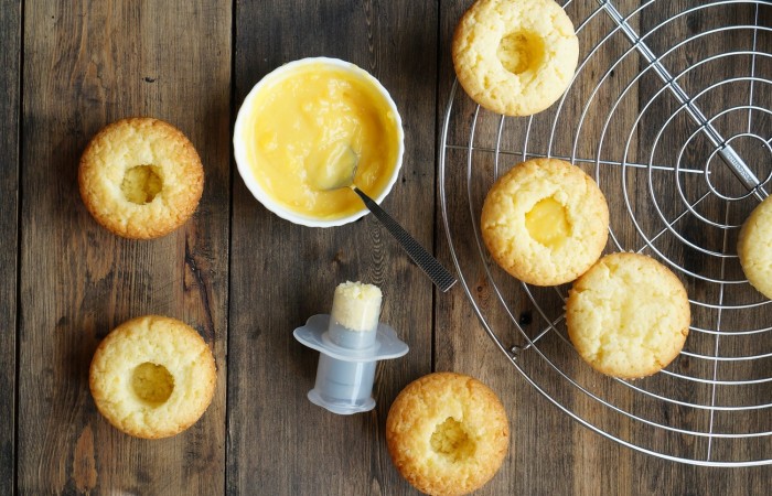 10По истечению времени достаем капкейки из духовки и остужаем. Достаем серединку из кексов и наполняем ее лимонным джемом.