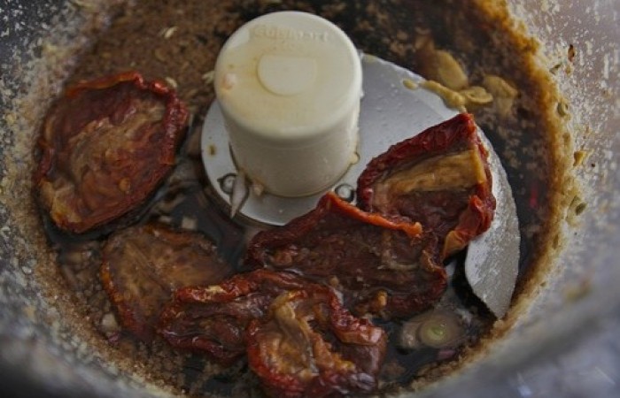4Измельчаем и добавляем замоченные помидоры с луком. Добавляем горчицу, уксус и соль. Продолжаем измельчать.