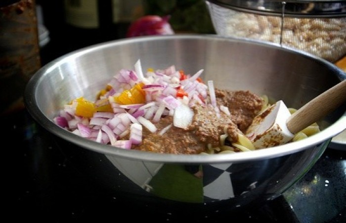 6В салатницу выкладываем порезанный кубиками лук, отварные макароны и обжаренный болгарский перец, а также добавляем заправку.