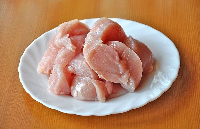 2Разделываем куриную грудку на филе. Отделяем мясо от костей.