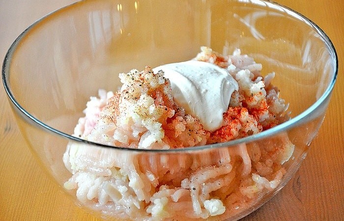 3Перекручиваем филе с луком, капустой и чесноком в мясорубке. Солим, перчим и добавляем сметану. Тщательно все перемешиваем.