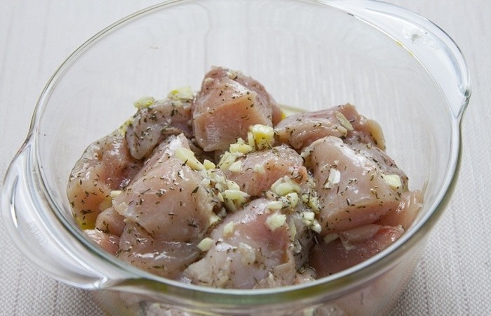 2Куриное филе нарезаем небольшими кусочками и выкладываем в миску. Добавляем рубленый чеснок, мяту, орегано, соль и перец. Тщательно все перемешиваем и оставляем мариноваться на час при комнатной температуре.