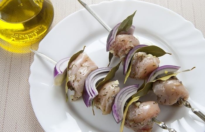 3Нанизываем филе на небольшие шпажки. Также нанизываем лук и лавровый лист (примерно 3-4 на каждую шпажку). Шпажки кладем на гриль или в духовку (в этом случае шпажки нужно замочить в воду на 30 минут, чтобы они не пригорели). Готовим 15-20 минут.