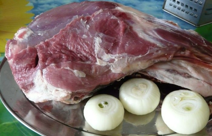 1Баранью ногу промываем и обсушиваем. Лук очищаем от шелухи.