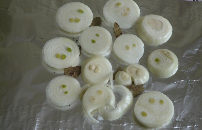 2Подготавливаем 2 кусочка фольги размером 45-50 см и накладываем их крест-накрест. Кладем нарезанный кольцами лук и лавровый лист.