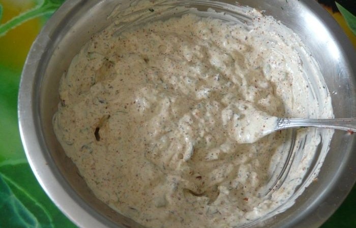 3Майонез смешиваем с пропущенным через пресс чесноком, перцем, базиликом и имбирем. Размешиваем все до однородности.