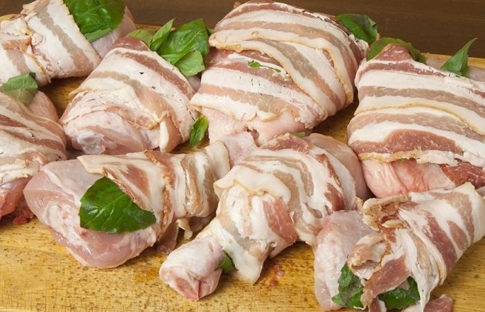 2Голени солим, перчим и кладем на каждую лист базилика. Заворачиваем каждую ножку в бекон и скрепляем концы.