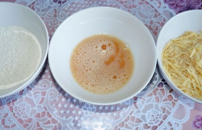 3В отдельной емкости взбиваем яйца с солью и перцем. Также подготавливаем емкость с мукой.