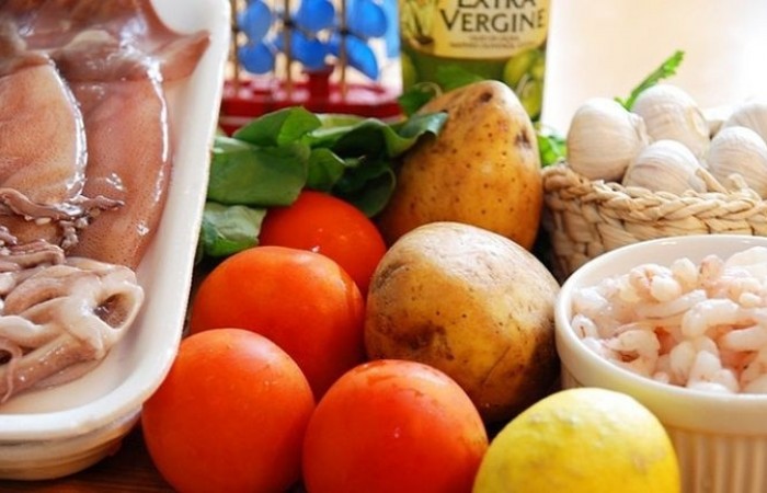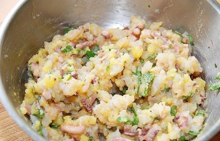 10В отдельной емкости смешиваем нарезанный кубиками отварной картофель, креветки, щупальца и мелко рубленый базилик. Добавляем желтковую смесь и тщательно все перемешиваем. Солим, перчим по вкусу.