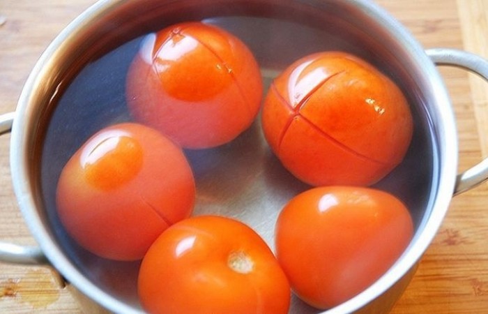 5На помидорах делаем крестообразные надрезы и ошпариваем их кипятком.