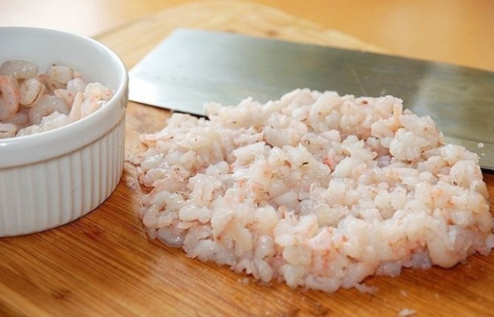 8Креветки отвариваем и тоже мелко нарезаем.