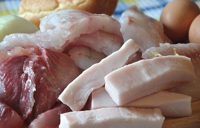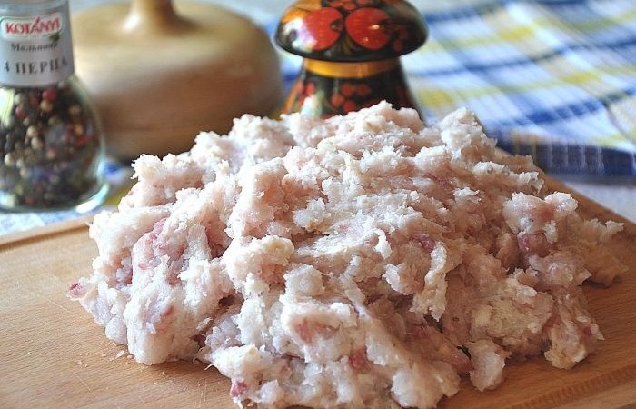 4Пропускаем через мясорубку рыбное филе, сало, лук и замоченный в молоке батон. Добавляем яйцо. Солим, перчим.