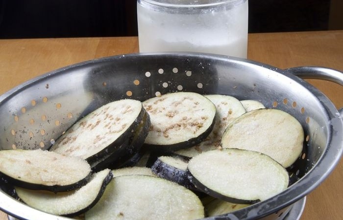 2Баклажаны нарезаем кружочками толщиной примерно 3-4 мм, выкладываем в дуршлаг и посыпаем солью. Оставляем на 30 минут, чтобы убрать горечь.