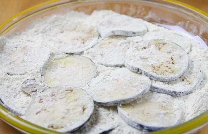3По истечению времени промываем баклажаны под холодной проточной водой и даем стечь жидкости. Обваливаем баклажаны в муке