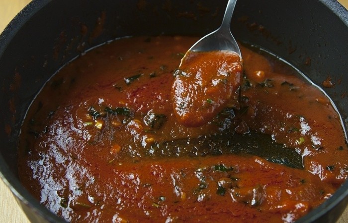 6Тем временем обжариваем измельченный чеснок с протертыми помидорами и тушим в течение 10 минут. Затем добавляем рубленый базилик и тушим еще 2 минуты.