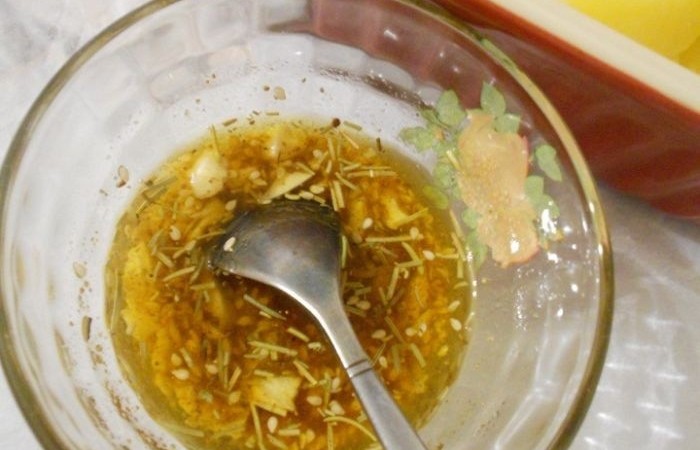 3Готовим заправку. Смешиваем паприку, кунжут, соль, перец, розмарин и пропущенный через пресс чеснок. Добавляем растительное масло и тщательно все перемешиваем.