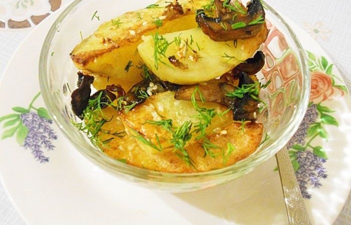5Запеченный картофель с грибами готов. Посыпаем рубленой зеленью и подаем к столу. Приятного аппетита!