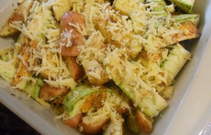 2Картофель с кабачками нарезаем ломтиками, посыпаем солью со специями и поливаем оливковым маслом. Тщательно все перемешиваем и выкладываем в форму для запекания.