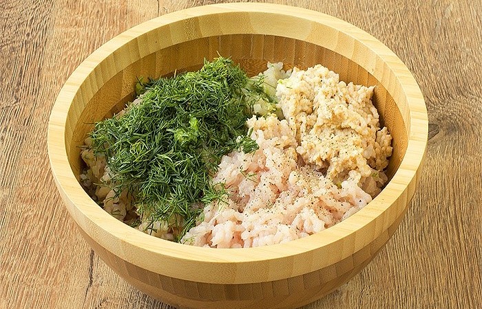 2Филе, лук и замоченный в молоке батон пропускаем через мясорубку. Добавляем рубленый укроп. Солим, перчим по вкусу и тщательно все перемешиваем.