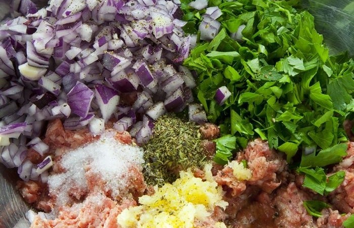 2В миске смешиваем фарш, пол пучка рубленой петрушки, измельченный чеснок, нарезанный мелкими кубиками лук, орегано и столовую ложку уксуса. Солим, перчим. Тщательно все перемешиваем, накрываем пищевой пленкой и ставим в холодильник на час.