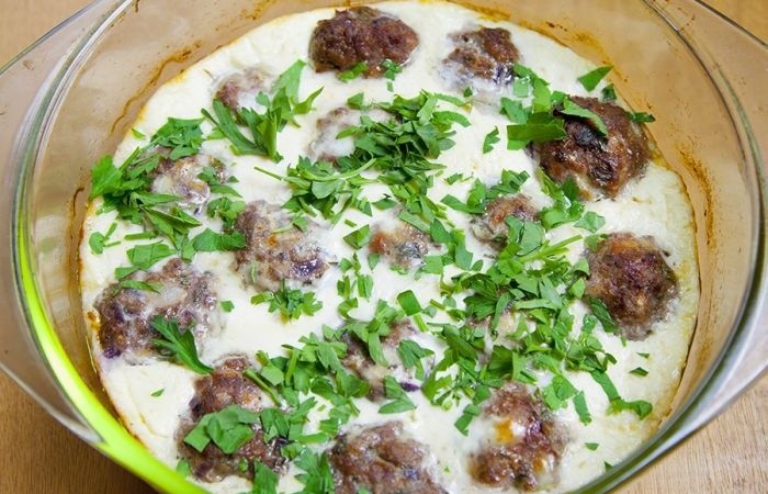 5Йогурт смешиваем с яйцами и оставшейся ложкой уксуса и заливаем этой смесью тефтели. Отправляем в духовку на 15 минут.
