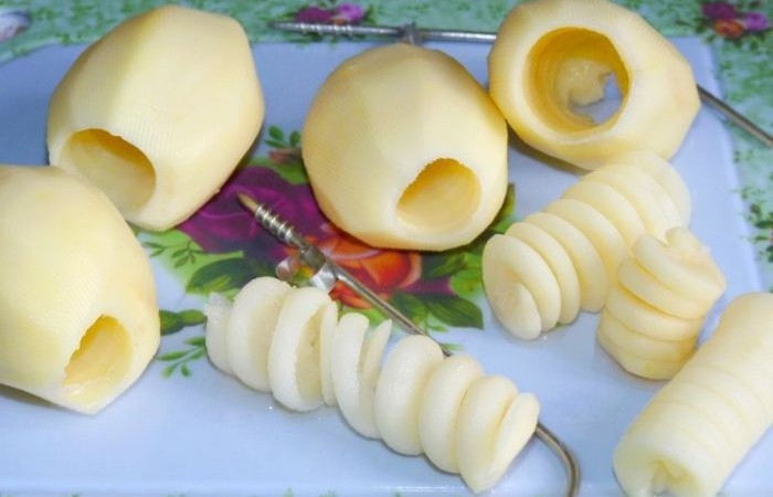 2С помощью специального ножа или обычного ножа делаем углубления в картофеле. Опускаем картофель в холодную подсоленную воду.