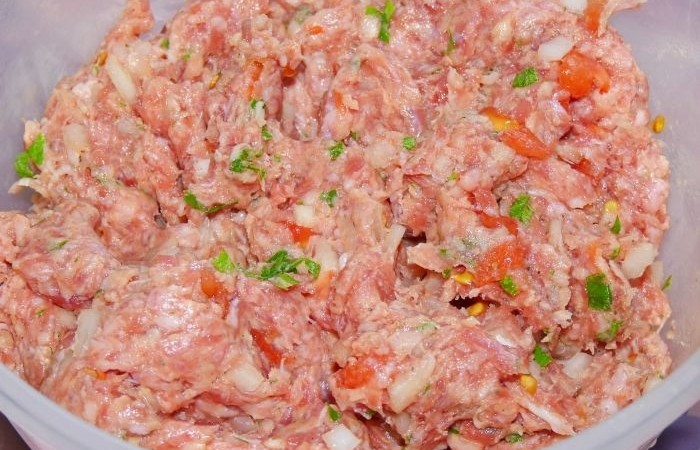 3Готовим начинку. Смешиваем в миске фарш, нарезанные кубиками помидоры, измельченный лук и рубленую зелень. Солим, перчим по вкусу и тщательно все перемешиваем.