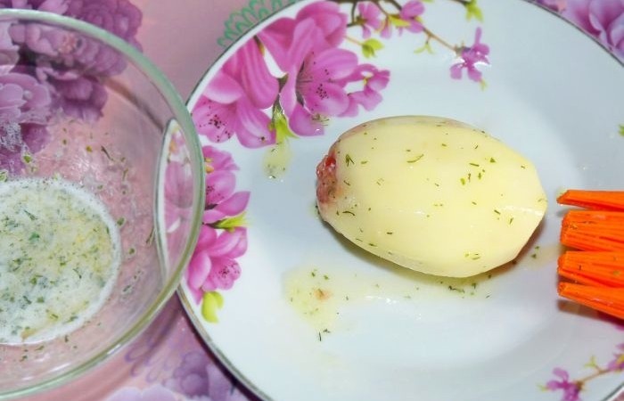 5Растапливаем сливочное масло и смешиваем с сушеной зеленью и измельченным чесноком. Обмазываем этой смесью картофель.