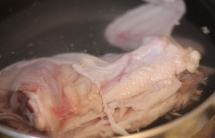 1Курицу заливаем тремя литрами воды (грудку с ножками вырезаем). Доводим до кипения, солим и варим до готовности.
