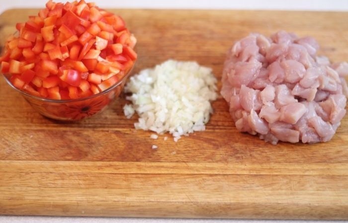 2Тем временем перец с куриной грудкой нарезаем маленькими кубиками, а лук измельчаем.