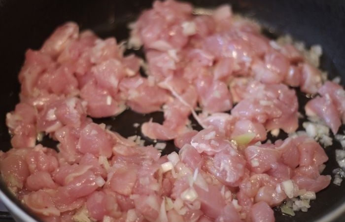4Разогреваем сковороду, наливаем масло и обжариваем курицу с луком в течение 10 минут.