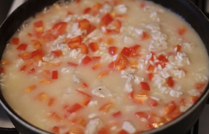 7Когда рис немного набухнет - добавляем перец.