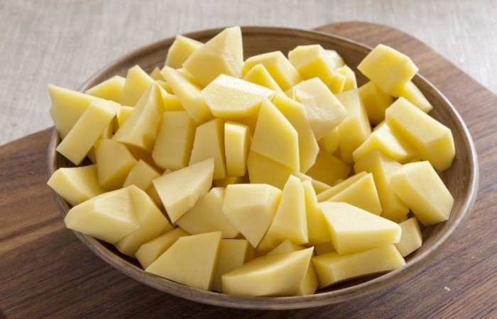3Картофель очищаем и нарезаем небольшими кусочками.