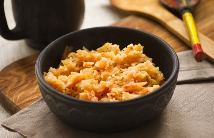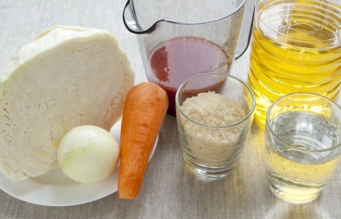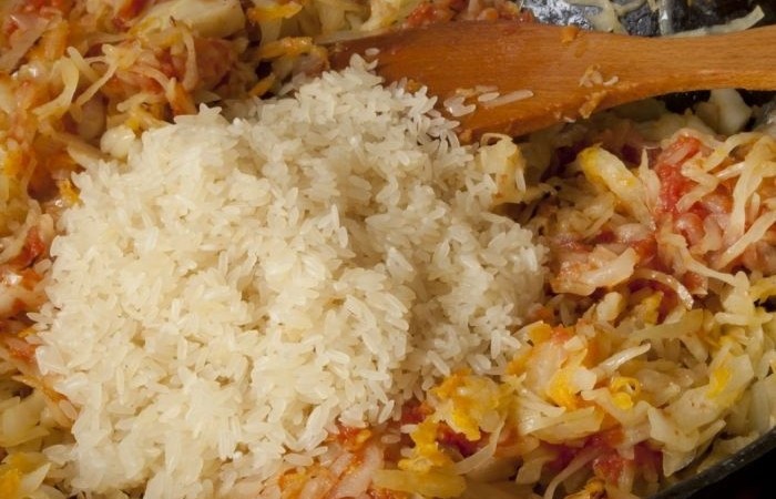 4Добавляем к овощам капуст, обжариваем в течение нескольких минут, а затем добавляем томатную пасту и тушим в течение 10 минут.