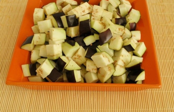 2Баклажаны нарезаем кубиками, солим и оставляем на 10 минут, чтобы они выделили сок.