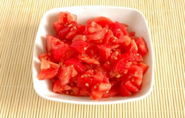 3Помидоры нарезаем небольшими кубиками, предварительно сняв с них кожу.