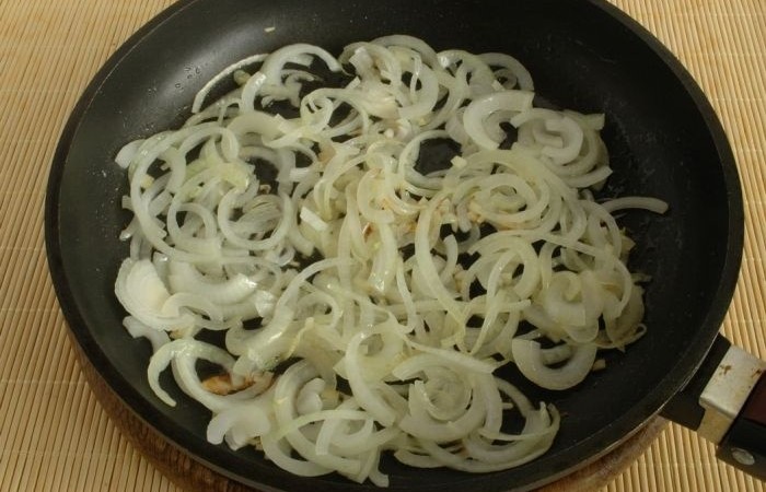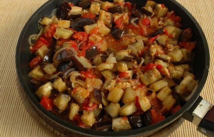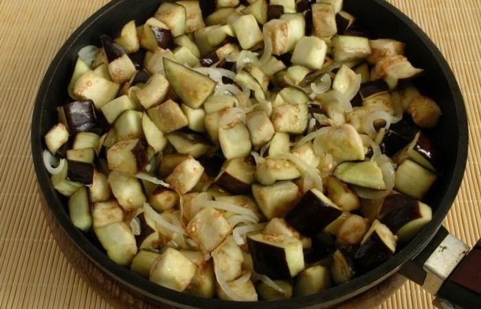 5Сливаем жидкость, выделившуюся из баклажанов. Добавляем их к луку и продолжаем обжаривать еще в течение нескольких минут.