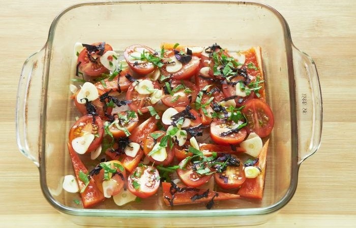 2Помидоры нарезаем пополам, перец произвольными небольшими кусочками, а чеснок кружочками. Выкладываем овощи в форму для запекания, посыпаем рублеными петрушкой с базиликом, сбрызгиваем оливковым маслом, солим, перчим и отправляем в духовку на 7-8 минут, предварительно разогретую до 180 градусов.