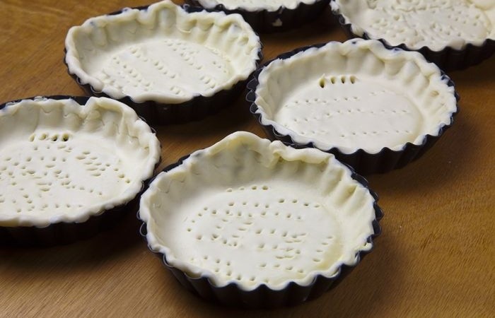 2Формочки смазываем сливочным маслом и выкладываем песочное тесто по диаметру формы. Дно накалываем вилкой и ставим в холодильник.