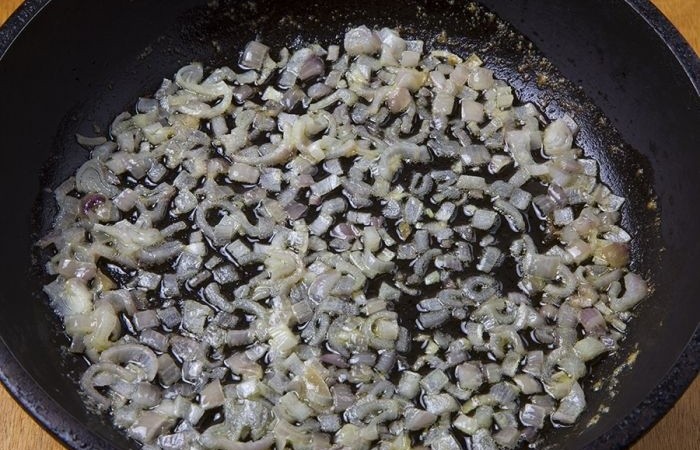 3Тем временем лук нарезаем мелкими кубиками и обжариваем на сливочном масле дл золотистости в течение 6-7 минут.