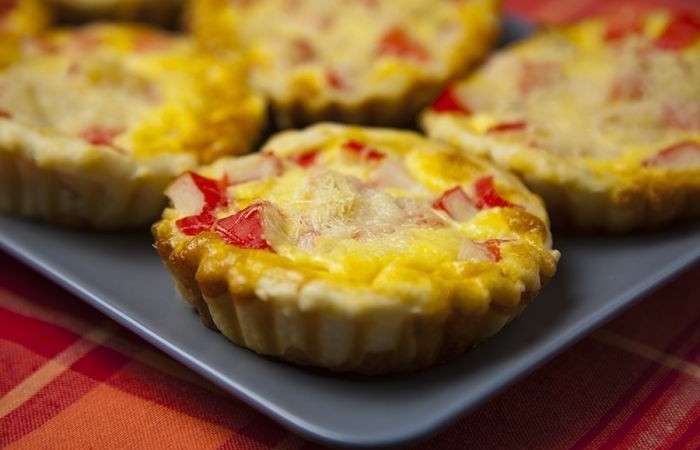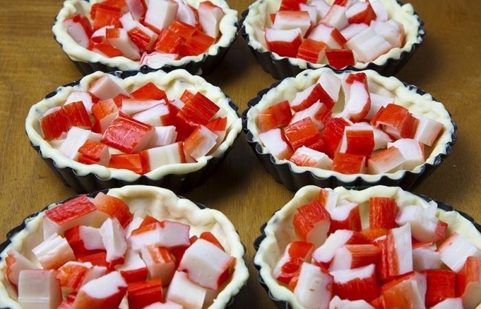 5Крабовые палочки нарезаем небольшими кубиками и выкладываем на песочное тесто.