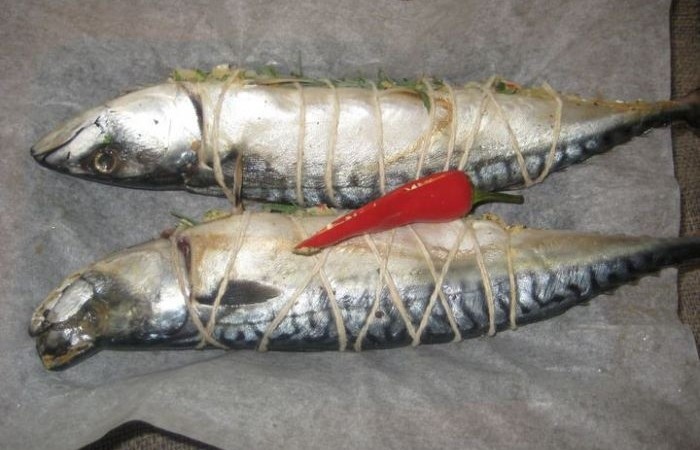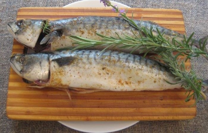 2Скумбрию разрезаем по брюшку, достаем внутренности, промываем тщательно и обсушиваем. Натираем солью и специями внутри и снаружи.