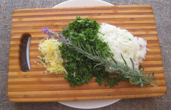 3Счищаем цедру лимона, лук нарезаем мелкими кубиками, а петрушку измельчаем.