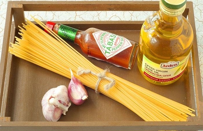 3Отварные спагетти добавляем к обжаренному чесноку. Добавляем несколько капель соуса табаско. Тщательно перемешиваем. Солим, перчим.