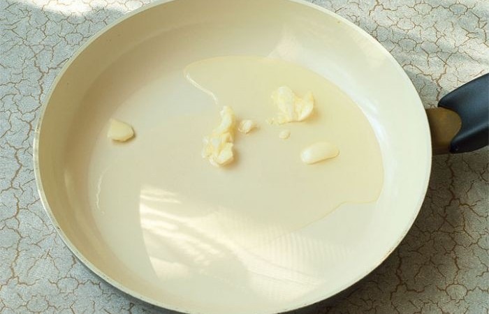2Раздавливаем чеснок плоской стороной ножа и обжариваем на оливковом масле в течение нескольких минут.