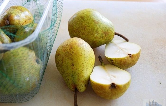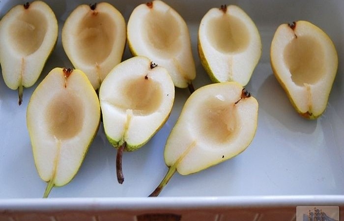 2Груши промываем и разрезаем пополам.