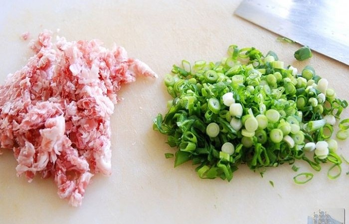 5Тем временем бекон нарезаем мелкими кусочками, а лук колечками.