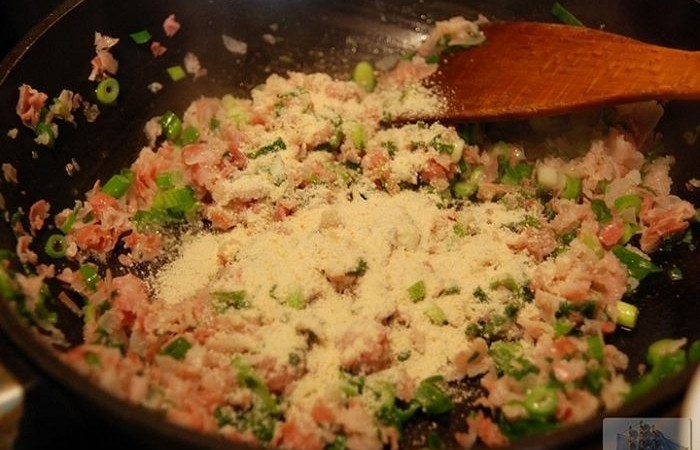 6Обжариваем бекон с луком на сливочном масле в течение нескольких минут, периодически помешивая. Затем добавляем панировочные сухари.