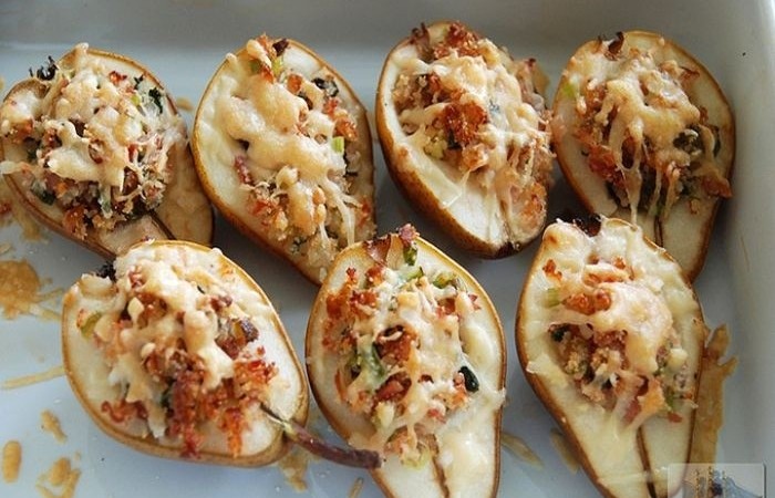 7Выкладываем начинку в груши, посыпаем тертым сыром и отправляем в духовку на 15 минут.